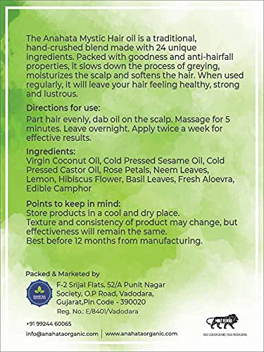 The Anahata Mystic Hair oil is a traditional, hand-crushed blend made with 24 unique ingredients. Packed with goodness and anti-hairfall properties, it slows down the process of greying, moisturizes the scalp and softens the hair. When used regularly, it will leave your hair feeling healthy, strong and lustrous.