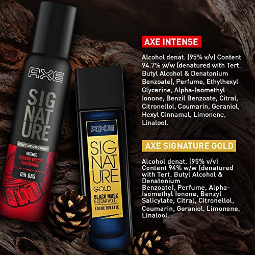 Axe, the World’s No. 1 Male Deodorant, brings you the Axe Exclusive Fragrance Collection for men – a curated fragrance experience that’s perfect for gifting. This incredible duo of Signature Intense Body Deodorant and Signature Gold Black Musk Perfume will ensure you smell great, always. Kickstart the day with Axe Signature Intense no gas body deodorant – a strong woody fragrance infused with Cinnamon bark, Sandalwood and a hint of Vanilla. The sensual and bold aroma of this deo lasts for 24 hours, giving you long-lasting all-day freshness. Simply hold the can upright and close to your body, then spray on your chest and neck. Don’t stress about using it directly on your body because Axe Signature Intense is totally safe to use on both skin and clothes. Elevate special occasions with the exotic fragrance of Signature Gold Black Musk & Cedar Wood Perfume. A warm woody fragrance with the traditional scent of Black Musk and distinctive Cedar Wood, it will make you the centre of attention at every event. This irresistible perfume comes packaged in a slick and sexy glass bottle. Just twist the cap and pull and hold the bottle upright. Then spray it on your neck, body and wrists and get ready to unleash your magic. Make your loved one feel special with the Axe Exclusive Fragrance Collection. This is sure to be one gift he’ll never forget!