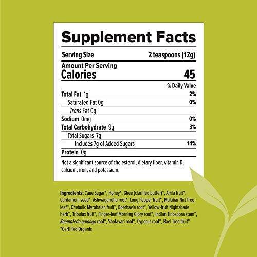 The ghee, honey, and raw cane sugar not only lend to the delicious taste, they also serve an important function as carriers and bring the herbs deeper into the tissues for full-body support.