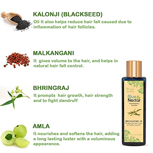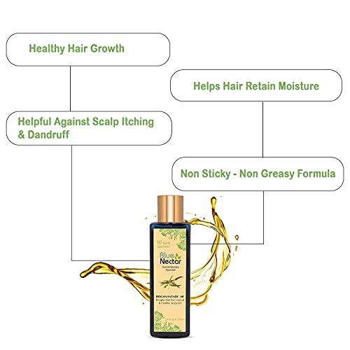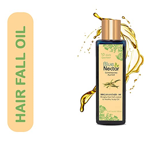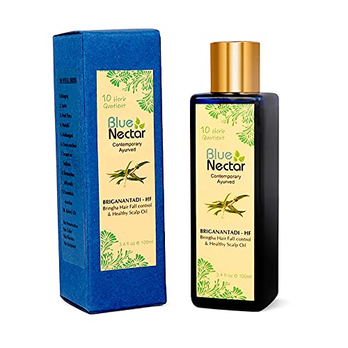 Blue Nectar Hair Fall Control & Healthy Scalp Oil is specially formulated with 10 Ayurvedic Herbs like Bhringraj, Amla, Neelpatra, Mulethi. Exceptionally good quality of this Hair Fall Oil is due to presence of these Ayurvedic Herbs. These Ayurvedic Herbs may help to reduce hair fall and help to promote hair growth. According to Ayurveda, hair is a by-product of bone tissue formation. Problem with formation of this tissue could cause hair loss or slow hair growth. Growth of hair or hair loss is dependent on Ayurveda Dosha called Pitta Dosha. Excess Pitta can cause hair loss & premature graying. Unhealthy diet, carbonated drinks could aggravate Pitta and further hair loss or slow hair growth process. Ayurvedic herbs like Amla, Bhringraj have cooling effect and is recommended to balance Pitta dosha and in turn may help to promote hair health. In an independent study done, topical treatment of Bhringraj extract played a key role in helping hair growth. Amla is rich in Vitamin C, has anti oxidant and is a natural hair conditioner for healthy hair & scalp. Methi (Fenugreek seed) is a known ayurvedic herb that is considered to be helpful to reduce hair fall and dandruff. Amla may also assist to boost scalp health. Blue Nectar Briganantadi Hair Fall Control Oil contains best of these 10 Ayurvedic Herbs that may help to fight Hair Fall and promote healthy scalp