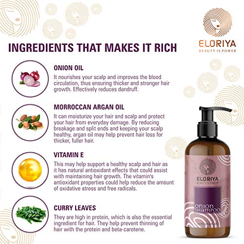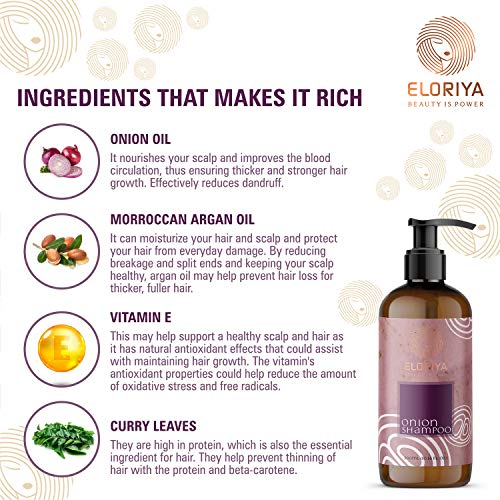 This red onion hair Shampoo by Eloriya is infused with vitamins that can help keep prevent your follicles from splitting and breaking. it also contains manjistha oil, black seed oil, bhringraj oil, and red onion oil. The combination of all these ingredients leaves the hair strands softer, shinier and easy to manage. This shampoo can help tame frizzy hair, repair and protect damaged follicles. Red onion cold-pressed oil can help strengthen the hair and reduce hair loss. The antibacterial and antiseptic properties of red onion oil is also known to fight inflammation and dandruff.