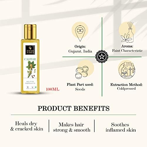 Give your skin and hair The nourishment they deserve with Good Vibes cold pressed castor oil. Rich in vitamin e, essential fatty acids and antioxidants, Good Vibes cold pressed castor oil provides intense nourishment and makes skin and hair healthy. It deeply moisturizes skin and heals dry or cracked skin. It makes skin soft and smooth, provides anti-ageing benefits and adds a natural glow. The anti inflammatory properties of castor oil help soothe skin irritation and reduce redness. When applied to hair, It promotes hair growth, improves hair elasticity, makes hair voluminous and naturally conditions hair. Good Vibes cold pressed carrier oils are naturally extracted from plants and are 100% pure, natural and undiluted. Our carrier oils are multipurpose in nature and provide a host of benefits. The ingredients used in our carrier oils are sourced from around the world to provide you the best in terms of quality and potency. Good Vibes cold pressed carrier oils are safe on skin and hair, tested for authenticity and cruelty free.