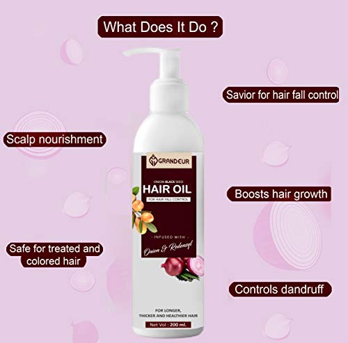 ✅HELPS IN HAIR GROWTH AND DANDRUFF CONTROL :- Grandeur onion hair oil is very helpful in hair growth as It has Real Red onion Extract which helps to fight infection of the scalp which opens up the hair roots of scalp and helps in promoting hair growth. So use this Regularly to show your love to your hair.