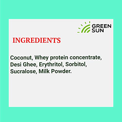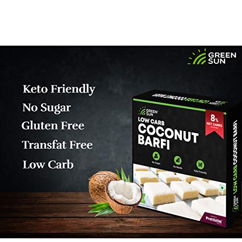 SUGAR FREE| KETO FRIENDLY | GLUTEN FREE | TRANSFAT FREE : Green Sun low Carb Coconut Barfi has no added sugar and uses diabetic friendly sweetner. So if you have a sweet tooth but have high sugar levels, you can still much on Green Sun low carb Barfi to satisfy your sweet tooth.