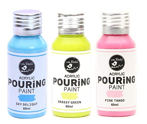 Little Birdie acrylic pouring paints are loaded with pigment which makes them vibrant, bright, and delightful to work with. Available individually and as sets, these pouring paints mix extremely well with pouring mediums and give a lovely texture and visual effect when dry. The paints intermix beautifully with each other creating exciting effects on canvas, paper, wood, earthenware, MDF bases, etc. These paints have excellent lightfastness and are resistant to fading. Smooth flow, flossy finish, vibrant hues, excellent coverage, fast drying; these paints ideal for fluid art have everything any artist can ask for. Dip, swirl, ring pour, funnel pour, Dutch pour, swipe, tree ring, or just flip the cup, try any paint pouring technique with these creamy, exciting paints to get superior results. They dry with a water-resistant finish.