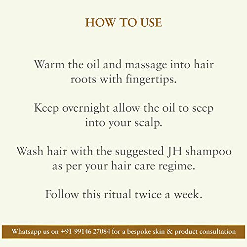USAGE: Warm the oil and massage into hair roots with fingertips. Keep overnight allow the oil to seap into your scalp. Wash hair with the suggested JH shampoo as per your hair care regime. Follow this ritual twice a week.