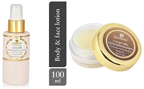Just Herbs Cascade Moisturizing Body Lotion for Dry Skin, Non-Sticky, For Men and Women, Paraben Free – 100 MLThis day care lotion is reinforced with the hydrating action of aloe vera and antioxidant properties of wheat germ oil. It restores moisture to the deepest layers of skin, and helps the skin to maintain its natural moisture thus plumping up fine lines that occur as a result of dryness. Vetiver helps rejuvenate the skin and improves skin regeneration process to enhance collagen elasticity thus improving the vital capacity of the skin to retain moisture.Just Herbs Coorgi Coffee Lip Smoothening Salve, 8 gAn indulgent lip remedy enriched with coffee extracts from the hilly slopes of coorgi in southern India, home to one of the world’s best coffee beans. This coffee lip balm is loaded with the anti-oxidant and detoxifying effect of coorgi coffee beans. This colorless buttery salve uses a base of certified organic beeswax, certified organic cold-pressed oils of avocado, safflower and sweet almond along with ultra moisturizing shea butter. Unlike petroleum jelly and other petroleum derived mineral oils, these natural ingredients not only seal in the lips moisture but also impart additional hydration to coarse and parched lips without clogging pores. Liquorice root extract helps brighten dull, darkened lips gradually giving them their natural sheen.