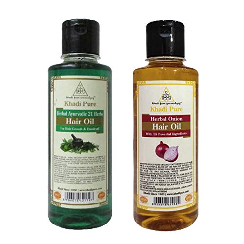 Khadi pure herbal ayurvedic 21 herbs hair oil applied for relaxation, helps to cool down scalp, anti-dandruff, gives smooth and manageable hair and anti-depressant and gives smooth and pure natural manageable hairs.Herbal onion hair oil is a beautiful blend of 100 % Natural oils and hair-friendly herbs. Enriched with red onion oil, this hair oil has sulphur, which minimizes hair breakage and promotes hair growth.