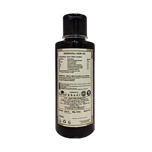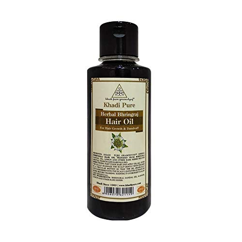 Khadi Pure Gramodyog Herbal Bhringraj Oil prepared from bhringraj sandal oil, lemon and other rare herbs relives mental tension and hair falling. Ingredients: Bhringraj, Sandal Oil, Kapoor, Lemon and Other Rare Herbs. Applicare: Part Your Hair and Apply Oil all Over the Scalp. Massage the Scalp Gently With Fingers In a Circular Motion So That the Oil Gradually Gets Absorbed Into the Scalp. Leave for an Hour or More Before Washing. Keeping It Overnight is Also Very Beneficial. Contents: 210ml Bottle. Country of Origin: India.