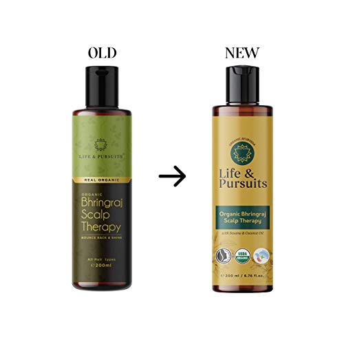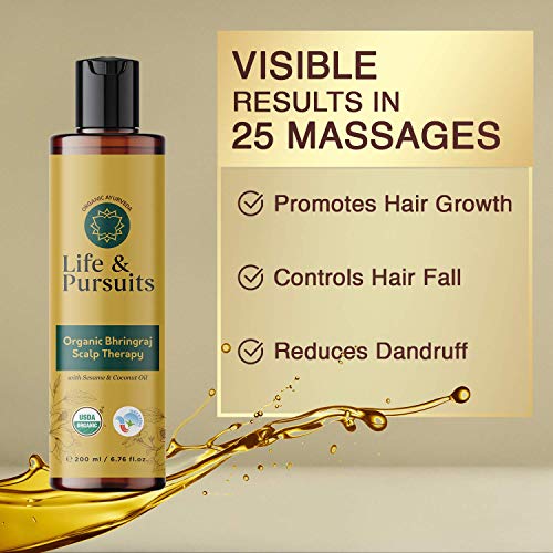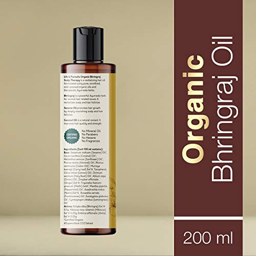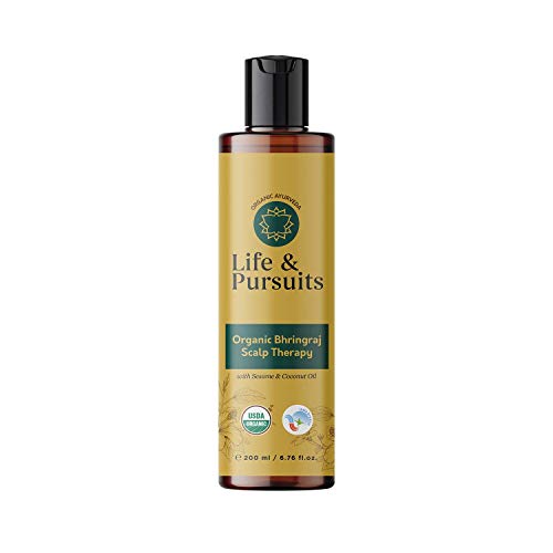 Life & Pursuits Bhringraj Scalp Therapy, an organic hair growth oil is a magical elixir for hair growth, scalp nutrition, hair fall control and dandruff. It’s an unique blend of cold-pressed certified organic oils infused with authentic Ayurveda herbs. Its deep revitalization effect on scalp promotes shiny, healthy and dense hair growth. It meets the highest organic standards of USA, Europe & India to be truly natural and has more than 95% certified organic ingredients.