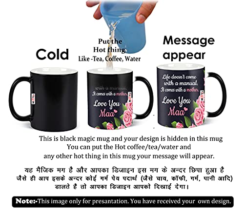 This is magic black mug and your design is hidden in this mug. You can put the Hot coffee/tea/water and any other hot thing in this mug your message will appear.