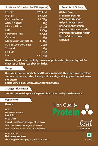Very High in Protein, With All the Essential Amino Acids- Quinoa is high in protein compared to most plant foods. It also contains all the essential amino acids and protein source for vegetarians and vegans.