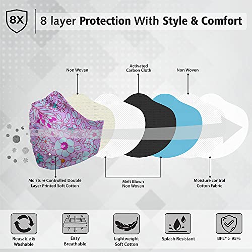 8 LAYERED FILTER SYSTEM: Our face mask has a 8-layered filtration system which consists of 3 layers of Moisture absorption knit fabrics and 5 layers of activated carbon Filter protection