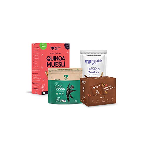Nourish you healthy combo- cranberry walnut nut mix 210 gm + black chia 150 gm + omega meal mix 200 gm + quinoa muesli ( honey & nuts) 375 gm. A healthy combo of nourish you products! This is a vegetarian product.