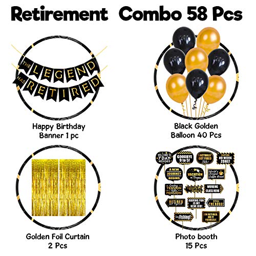 QUANTITY IN A PACK: The Retirement theme decoration items packet includes:- 2Pcs golden fringe foil curtains, 40Pcs black and golden metallic balloons, 1Pc happy retirement theme ” The legend has retired” letter banner and 15Pcs happy retirement theme photo booth props. This happy retirement theme party products are perfect for any one like papa, mumma, teachers, grandfather, mother, grandmother, employees or friends who are retiring.VALUE DECORATION PACKAGE: These happy retirement theme decorations package is a complete set of 58Pcs propz to set up a perfect backdrop for these theme. To make any backdrop we just need a golden foil curtain, retirement banner, metallic balloons and you can use the special retirement theme photobooth props from packet to make a perfect pictures which can be relished for long.HIGH QUALITY | REUSABLE | ECONOMICAL – The legend has retired banner is made of high quality cardstock. Golden fringe foil curtain is very good quality and DEFINATELY of same length from bottom and measures exactly 3Ft by 6FT. Golden and black metallic balloons are 9″ in size and it DO NOT BURST if not overfilled with air. You can fill helium gas or air in the metallic baloons.Retirement theme Photobooth props is PRE-STUCK in our warehouse.These retiremnt theme decor makes a perfect celebration.EXCLUSIVE DESIGN – Happy Retirement theme black and gold party decoration is exclusively designed by our team. We believe in making any theme parties STAND OUT. Your celebration and our propz makes a great combination for a HIT PARTIES.A PERFECT GIFT: This retirement theme decorations pack is a perfect gift for anyone who is retiring. This packet of retirement theme can be gifted to your mother, father, teacher, student, grand papa, grand mother, collegues, employee, old friends or just anyone. A surprise gift is always loved by everyone.