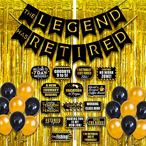 HIGH QUALITY | REUSABLE | ECONOMICAL – The legend has retired banner is made of high quality cardstock. Golden fringe foil curtain is very good quality and DEFINATELY of same length from bottom and measures exactly 3Ft by 6FT. Golden and black metallic balloons are 9″ in size and it DO NOT BURST if not overfilled with air. You can fill helium gas or air in the metallic baloons.Retirement theme Photobooth props is PRE-STUCK in our warehouse.These retiremnt theme decor makes a perfect celebration.