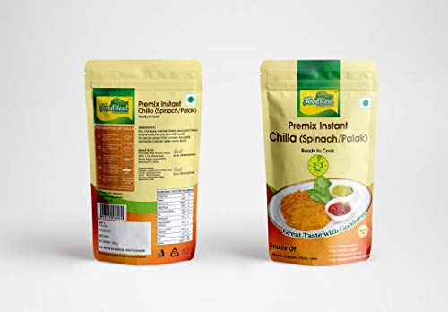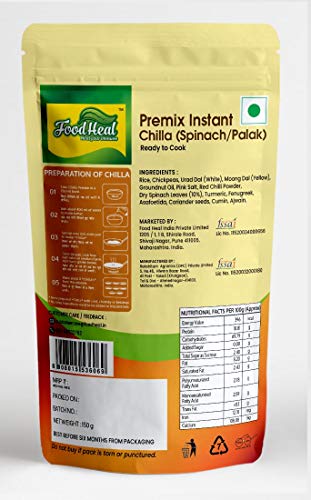 Spinach is a great source of Iron and is accepted universally as a nutritious food. Food Heal India’s Palak Chilla premix brings the goodness of spinach to your table, combined with the mix of ground spices like fenugreek, asafoetida and ajwain ensures that the Palak Chilla is an instant hit with the whole family at mealtimes. Source of – Protein, Calcium, Fibre, Iron. Ingredients – Rice, Chickpeas, Urad Dal (White), Moong Dal (Yellow), Groundnut Oil, Pink Salt, Red Chilli Powder, Dry Spinach Leaves (10%), Turmeric, Fenugreek, Asafoetida, Coriander seeds, Cumin, Ajwain. No Preservative. No Added Sugar. No Artificial Flavour. No Added Artificial Colour. Nutritiona Information : Nutritional Facts Per 100g ( Approx ) Energy Value – 396g Protein – 10.81g Carbohydrates – 69.79g Added Sugar – 0.00g Total Sugar as Sucrose – 2.40g Fat – 8.20g Saturated Fat – 2.43g Polyunsaturated Fatty Acid – 2.78g Monounsaturated Fatty Acid – 2.59g Trans Fat< 0.1g Iron12.10mg Calcium108.08mg PREPARATION OF CHILLA Preparation of Chilla Take the Premix Instant Chilla in a bowl of 750 ml. Add about 400 ml of water into the Bowl and whisk together to make a smooth batter. Heat the non stick pan and when it is hot enough, take a ladle full of the Chilla batter and pour on the center of the pan and spread it to make the Chilla. Cook the Chilla on medium flame till the top looks cooked & then flip & cook the other side too. Cook upto 2 to 3 minutes on both sides till it turns crisp & golden brown. Make about 8 Chilla's with this batter. Serve hot & ready Chilla's with curd, chutney or ketchup. Note - No other ingredients need to be added to this mixture.