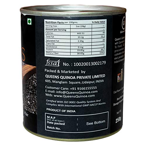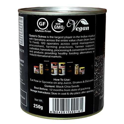 Queen’s Quinoa Black Chia Seed 250g Pack of 2, Total 500 Gram weight of Package Black Chia Seeds from Queens Quinoa are Naturally Grown in India without the use of Chemical Fertilizers & Pesticides. Chia seeds are an excellent source of omega-3 fatty acid & Fiber at 10 grams per ounce (about 2 tablespoons) and contain protein and minerals including iron, calcium, magnesium, and zinc. Emerging research suggests that including Chia seeds as part of a healthy diet may help improve cardiovascular risk factors such as lowering cholesterol, triglycerides and blood pressure How to Eat Chia Seeds: Chia seeds can be eaten raw or prepared in a number of Dishes/ Shakes/ Drinks. Sprinkle ground or whole Chia seeds on cereal, rice, yogurt or vegetables.