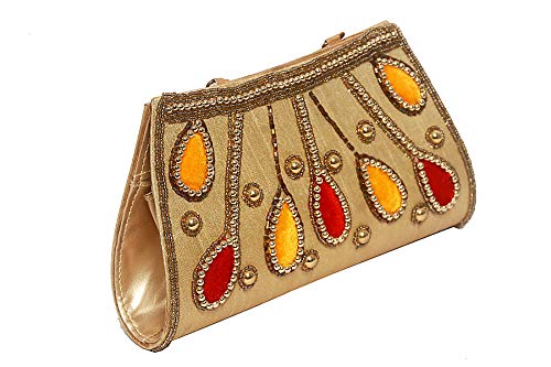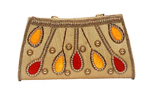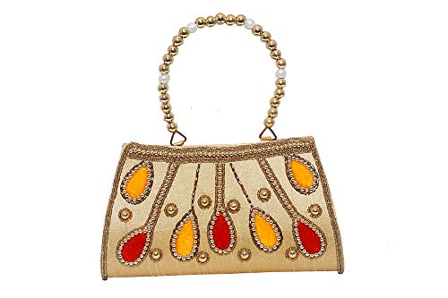 Trendy Light Golden Color Bridal clutch cum handbag with velvet colored flower design Specially Made For the Girls & Women.This Handbag Designed With Extraordinary Soft Shinning Materials gives the rich look to your personality. Stylish Latest new trend causual daily use this hand clutch with press ON/OFF buttons with zipper coach inside.Easy to carry with stylish artificial pearl Handle.Perfect to keep Mobile ,Accessories,Makeup Kit, can be easily kept inside it,Suitable for Occasions like Wedding, Casual,Function, Daily and Office,Festivals etc