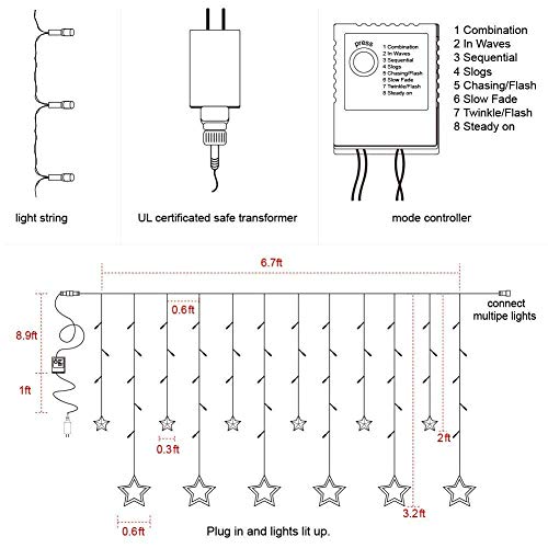 Easy to usE: 12 Stars(2 sizes), total 138pcs led curtain string lights, 29V Low voltage and UL Listed power supply, directly plug in and unplug for power on and off