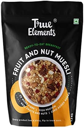 True Elements Fruit and Nut Muesli is a light and crispy variety of nuts Muesli ready to eat breakfast which is loaded with dried fruits and nuts. It is a tasty treat for your family offering a pleasant flavour but not compromising on your health. The delicious blend of dried fruits and nuts with natural whole grains makes it a perfect breakfast crunchy muesli for health-conscious people, who do not want to give up on taste while on a diet. From providing you with a rich taste of natural elements in it, this breakfast fruit muesli also supports your health and improves your well being. Enjoy your fruit and nut muesli for breakfast.
